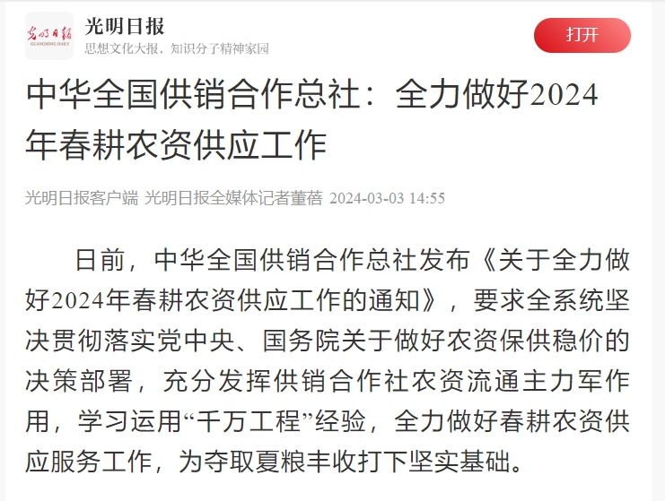 【?光明日報(bào)客戶端】中華全國供銷合作總社:全力做好2024年春耕農(nóng)資供應(yīng)工作