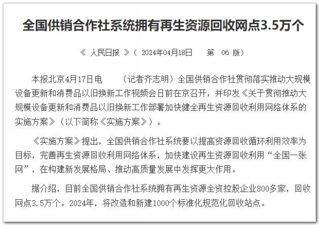 全國(guó)供銷(xiāo)合作社貫徹落實(shí)推動(dòng)大規(guī)模設(shè)備更新和消費(fèi)品以舊換新工作視頻會(huì)日前在京召開(kāi),并印發(fā)《關(guān)于貫徹推動(dòng)大規(guī)模設(shè)備更新和消費(fèi)品以舊換新工作部署加快健全再生資源回收利用網(wǎng)絡(luò)體系的實(shí)施方案》(以下簡(jiǎn)稱(chēng)《實(shí)施方案》)。